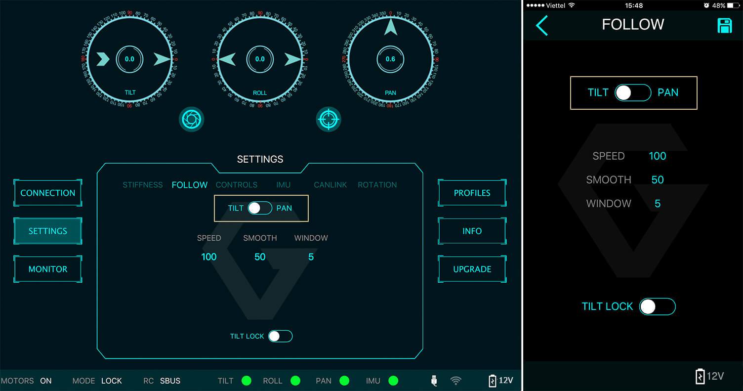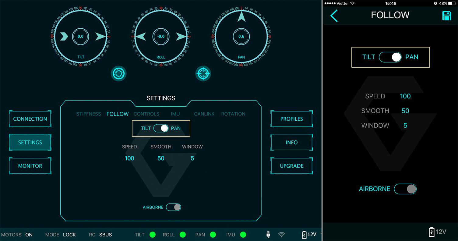 The most widely used mode of single operation is Follow mode where the gimbal operator controls to pan and tilt of the camera. The camera movement will mimic the user’s input from the top-mount while the footage remains stable. The follow mode can be configured to be either very linear and robotic, or smooth and cinematic.
