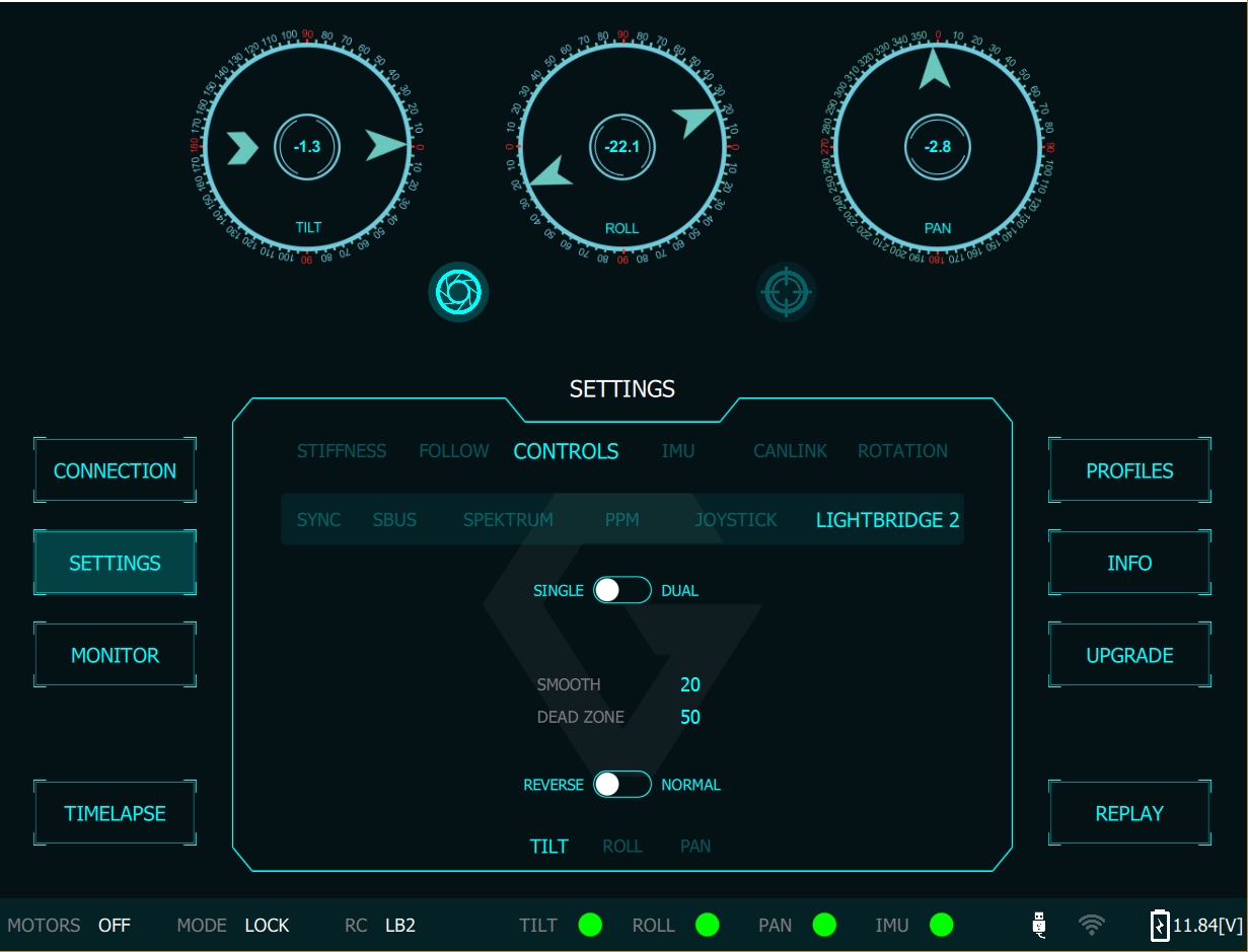 - Go to Setting -> Controls -> LightBridge 2 -> Single - Move GIMBAL DIAL on the remote to turn on the motors. - Toggle C1 to control tilt or pan (make sure Tilt in TILT LOCK , go to SETTINGS -> FOLLOW-TILT->TILT LOCK). - Pan will be in follow mode if not use GIMBAL DIAL for PAN control. At Dual Mode, in software: