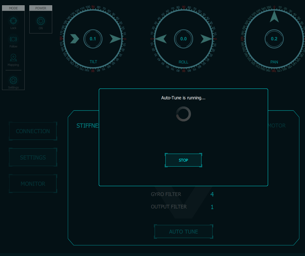 <figure><img src="https://3309772875-files.gitbook.io/~/files/v0/b/gitbook-x-prod.appspot.com/o/spaces%2FnikHUDUd2JXqkOsnOi7l%2Fuploads%2F6vNAzcanM8jCSkCHcPpZ%2F2.png?alt=media&#x26;token=03720c88-e4c5-423c-bc27-1bcd191a5f30" alt=""><figcaption><p><em>Press the button to do Auto tune for the gimbal</em></p></figcaption></figure>