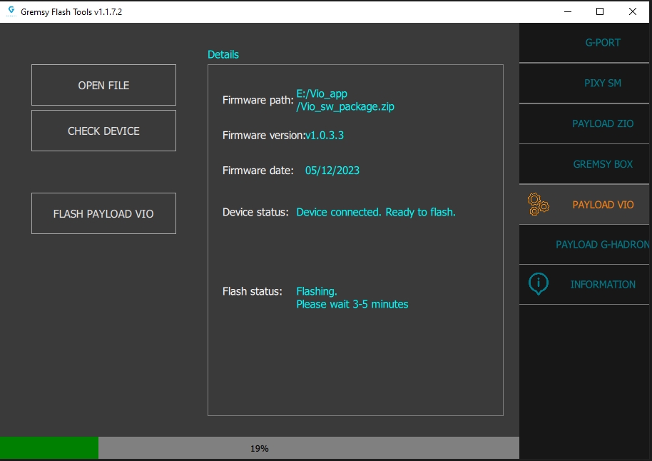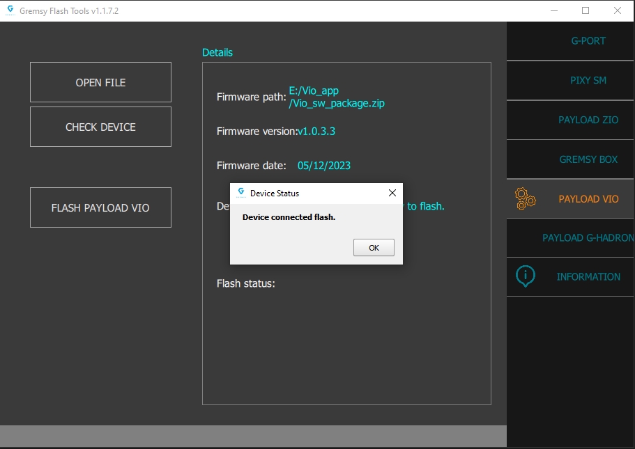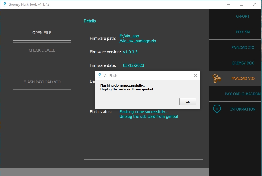 Checking the connection between GremsyFlashTools app and the Vio/Zio payloads.